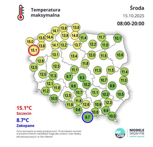 - temperatura maksymalna zmierzona przez oficjalne stacje IMGW we środę 15 października.