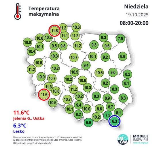 - temperatura maksymalna zmierzona przez oficjalnie stacje IMGW w niedzielę 19 października.