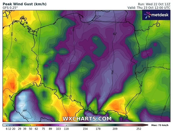 - spodziewane maksymalne porywy wiatru w czwartek o 14 CEST.