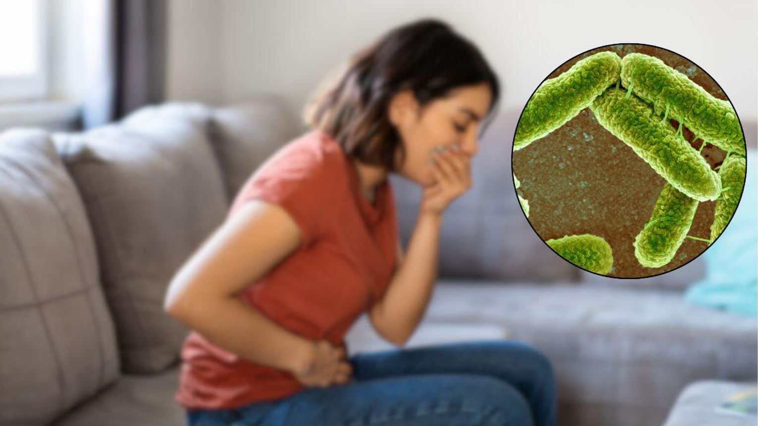 Zdjęcie przedstawia kobietę z mdłościami i bakterie e.coli