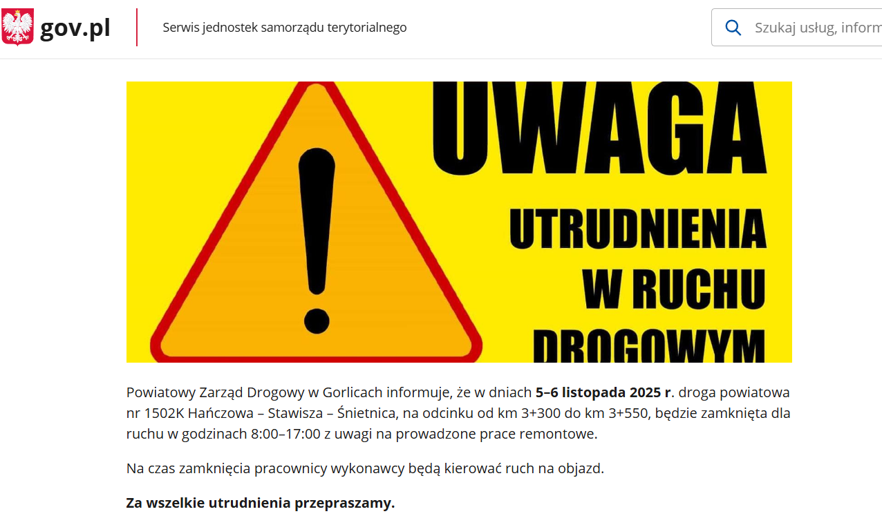 Powiatowy Zarząd Drogowy w Gorlicach informuje, że w dniach 5–6 listopada 2025 roku, w godzinach 8–17 zamknięty zostanie odcinek drogi powiatowej nr 1502K Hańczowa – Stawisza – Śnietnica (od km 3+300 do km 3+550).
