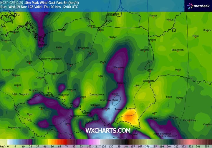 - spodziewane maksymalne porywy wiatru w czwartek do południa.