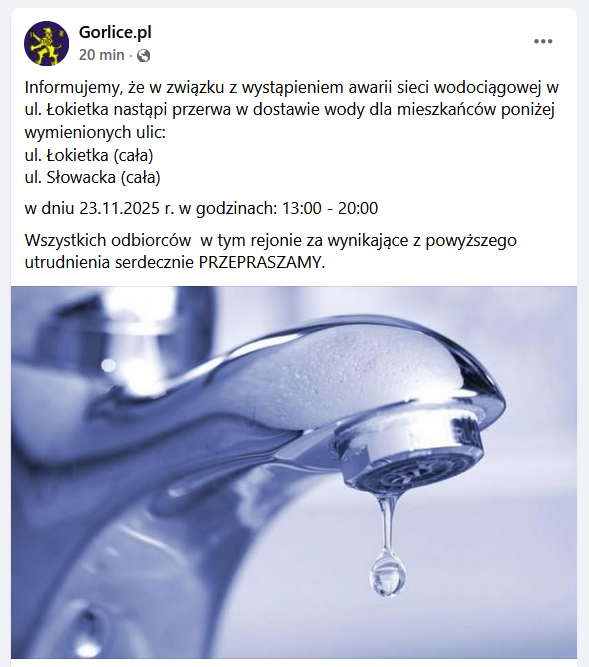 Jak poinformowało miejskie przedsiębiorstwo wodociągowe, w niedzielę 23 listopada 2025 roku doszło do awarii sieci wodociągowej na ul. Łokietka. Uszkodzenie jest na tyle poważne, że konieczne było wstrzymanie dostaw wody do części odbiorców.