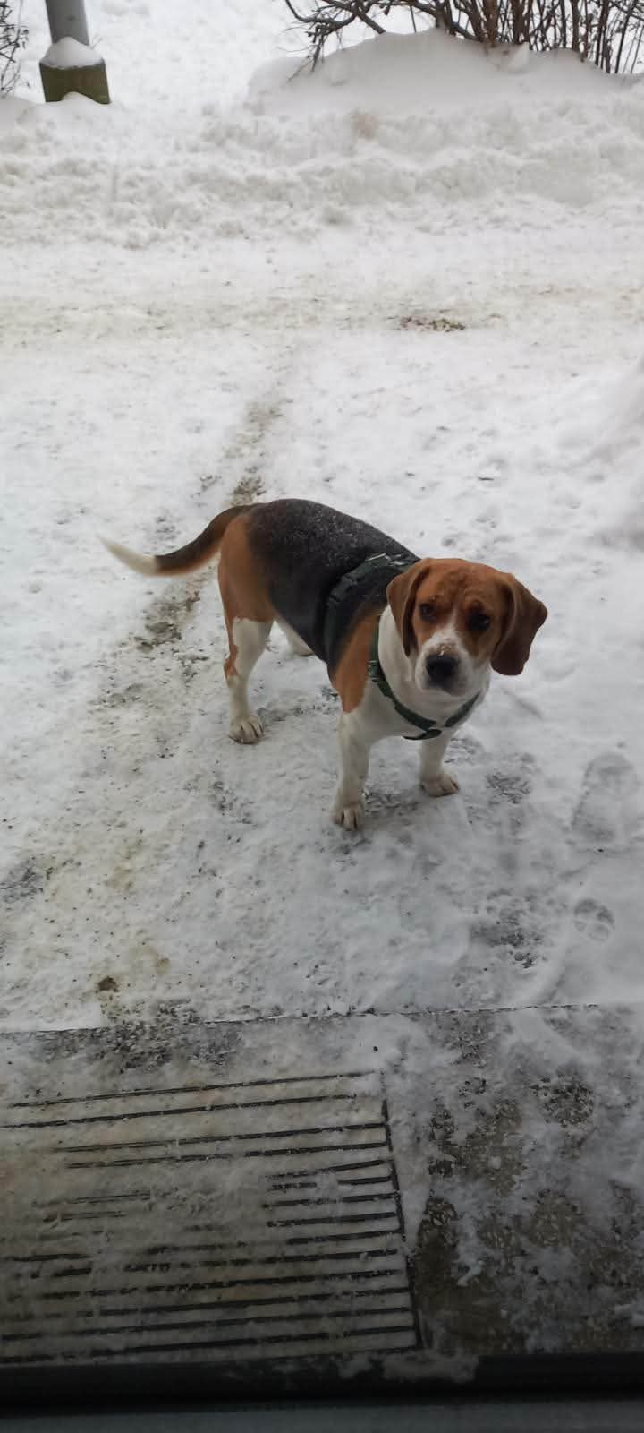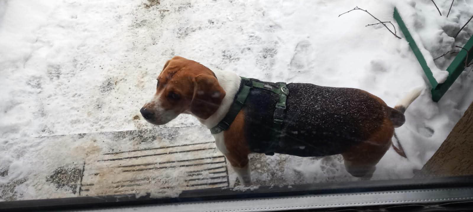 Na ul. Kopernika w Gorlicach zauważono biegającego psa rasy beagle w zielonych szelkach.