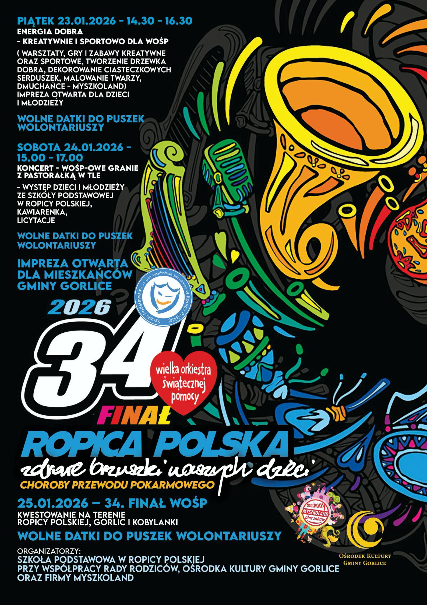 W finałowe granie aktywnie włącza się również Ropica Polska. W Szkole Podstawowej im. gen. Władysława Sikorskiego zaplanowano wydarzenia, które połączą pomoc z kreatywną zabawą i muzyką.