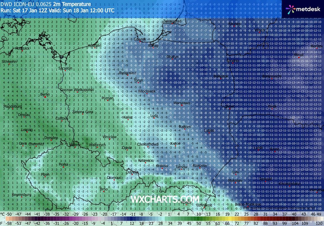 Natomiast podczas niedzielnego popołudnia maksymalna temperatura będzie mogła przekroczyć miejscami przekroczyć granice 0.