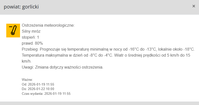 Dzisiaj (19 stycznia 2026) o godz. 11:55 wydano ostrzeżenie meteorologiczne pierwszego stopnia przed silnym mrozem z prawdopodobieństwem wystąpienia zjawiska na poziomie 80%.