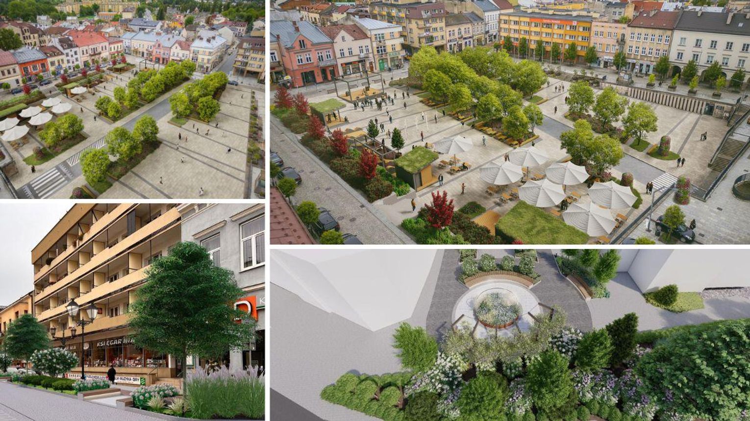 Wizualizacje pokazują Rynek z większą liczbą drzew i rozbudowanymi rabatami. Widać pergole oraz zadaszone wiaty z zielonymi dachami, a także strefy gastronomiczne z parasolami i miejscami do siedzenia. Kompozycja jest czytelna: więcej zielonych wysp, mniej otwartej, jednolitej płyty.