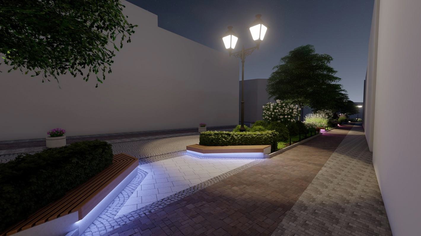Na obrazach widać także detale, które zwykle budzą zainteresowanie mieszkańców, donice i rabaty rozdzielające przestrzeń, większą liczbę ławek oraz oświetlenie, w tym efekt podświetlenia elementów małej architektury w nocnym ujęciu. To estetyka deptaka z ogrodem, która dobrze wygląda na planszach, ale w odbiorze ulicy kluczowe będą materiały, wykonanie i późniejsze utrzymanie.