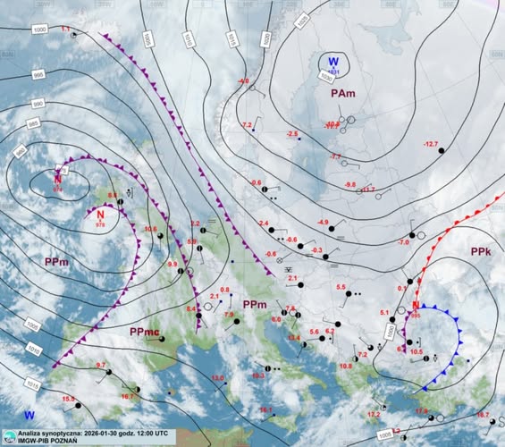 Sobotnia temperatura maksymalna została osiągnięta już po północy. Na termometrach zobaczymy średnio od -4 do -6 stopni. Wraz z upływem czasu będzie postępował spływ arktycznego powietrza, przez co podczas nocy z piątku na sobotę będzie cieplej niż podczas sobotniego popołudnia.