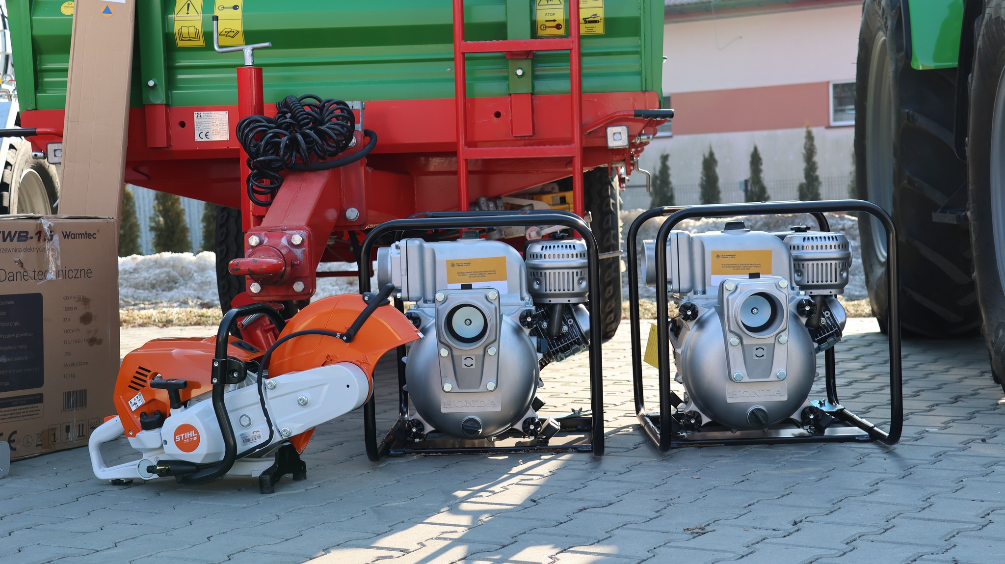 W tej kategorii znalazły się koparka kołowa oraz ciągnik z przyczepą. To wyposażenie przydaje się przy usuwaniu skutków podtopień, awarii i zniszczeń infrastruktury, a także przy pracach porządkowych w terenie. Ułatwia też szybki przewóz materiałów i sprzętu w miejsce zdarzenia.