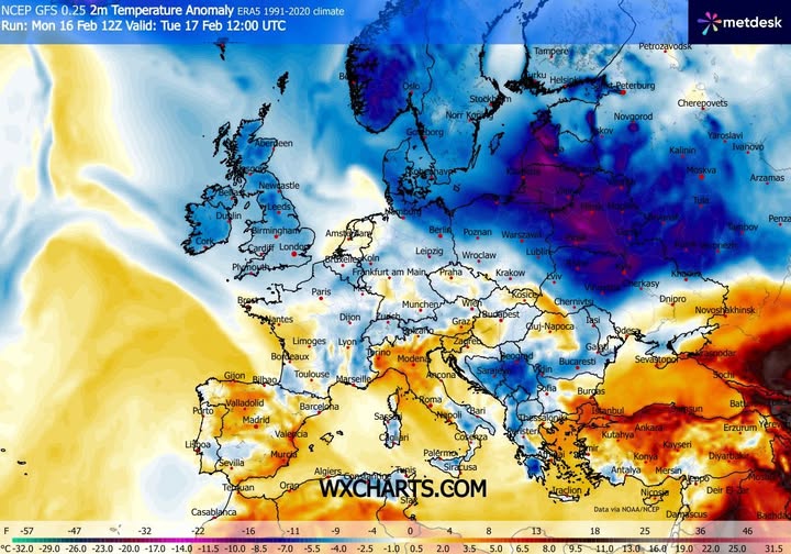 - spodziewana anomalia temperatury w Europie we wtorek o 13 CET. W naszej okolicy anomalia będzie w granicach normy.