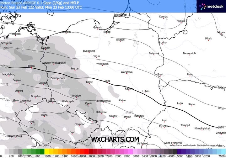 - spodziewany niewielki wzrost CAPE w poniedziałek o 13 CET.