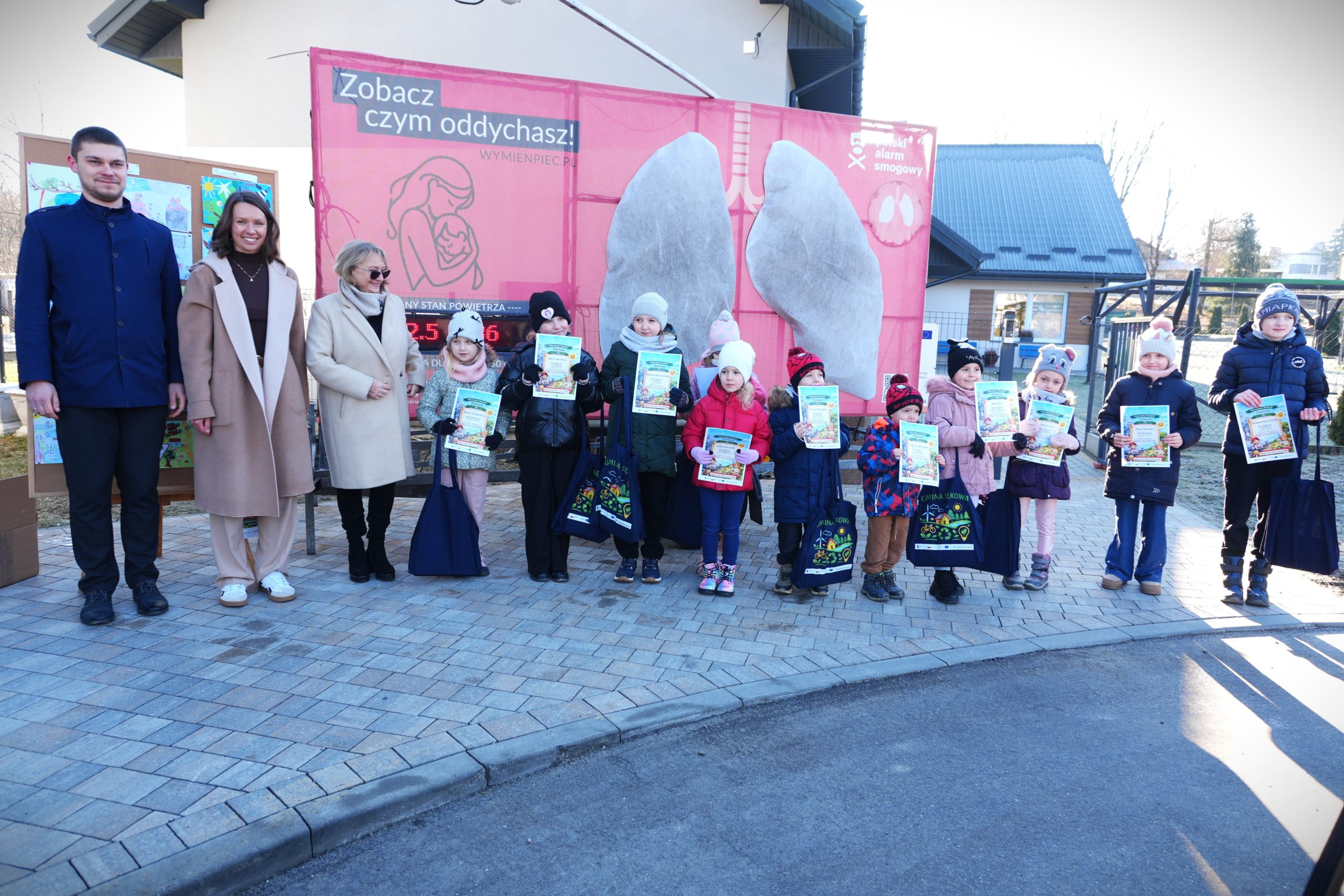 Podczas uroczystego rozstrzygnięcia Małgorzata Małuch, wójt gminy Sękowa, podkreśliła znaczenie troski o czyste powietrze i budowania świadomości ekologicznej od najmłodszych lat. Wraz z sekretarzem gminy Mateuszem Ślęzakiem wręczyła nagrody i pamiątkowe dyplomy.