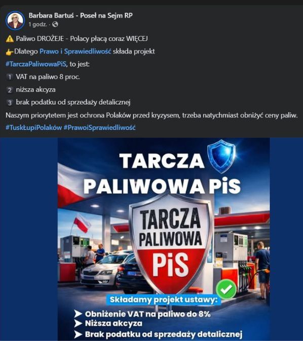 Temat cen paliw ponownie powraca do debaty publicznej. Politycy Prawa i Sprawiedliwości zaprezentowali projekt nazwany „Tarczą Paliwową PiS”, który – według zapowiedzi – miałby doprowadzić do obniżenia kosztów tankowania dla kierowców. W przestrzeni publicznej pojawiają się przy tym mocne hasła polityczne, takie jak „Tusk łupi Polaków”. Jednocześnie coraz częściej pojawiają się pytania, czy proponowane rozwiązania są rzeczywistą odpowiedzią na sytuację rynkową, czy raczej elementem bieżącej walki politycznej.