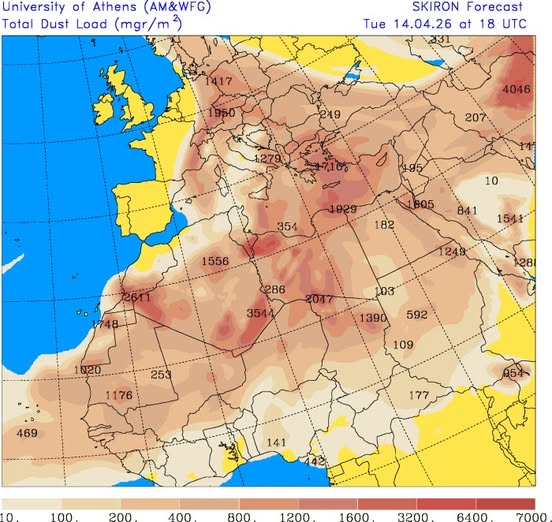 - prognozowana zawartość pyłu saharyjskiego w atmosferze w Europie we wtorek o 20 CEST.