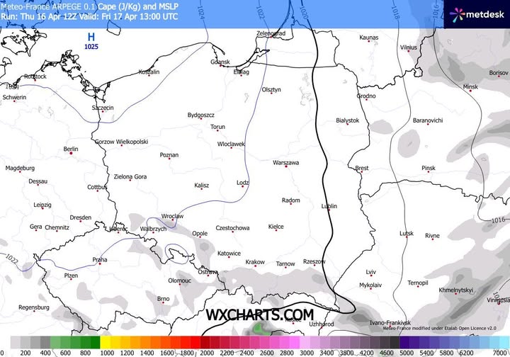 - spodziewany niewielki wzrost energii CAPE w piątkowe popołudnie.