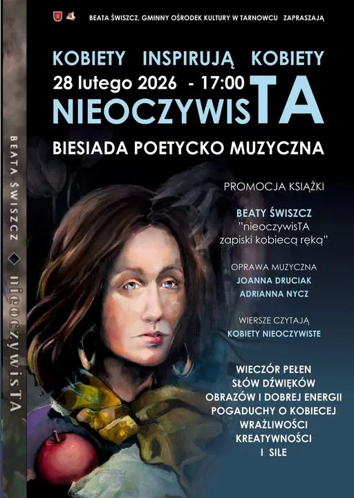 Wydarzenie 'Kobiety Inspirują Kobiety - NieoczywisTA' to biesiada poetycko-muzyczna, która odbędzie się 28 lutego 2026 roku o godzinie 17:00 GOK w Tarnowcu. W trakcie spotkania odbędzie się promocja książki Beaty Świszcz. Oprawę muzyczną zapewnią Joanna Druciak i Adrianna Nycz, a wiersze czytać będą Kobiety Nieoczywiste. Wieczór pełen będzie słów, dźwięków, obrazów i dobrej energii, z pogaduchami o kobiecej wrażliwości, kreatywności i sile.